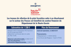 Les travaux de réfection de la piste forestière, suite à un éboulement sur le secteur des Frasses, ont bénéficié du soutien financier du Département de la Haute-Savoie Décision de la Commission Permanente du 03 novembre 2025 Subvention attribuée dans le cadre du Plan Forêt. Dépense subventionnable : 4.460 € HT Taux de subvention : 30 % Subvention Départementale : 1.338 € Plan de financement Coût de l’opération : 4.460 € HT Financements : Département : 1 338 € (30%) Commune de Megève : 3.122 € (70%)