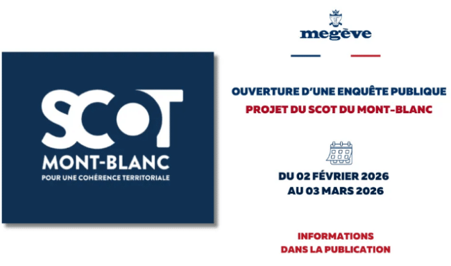 Une enquête publique est ouverte sur le projet de SCoT Mont-Blanc du 02/02/2026 à 08h00 au 02/03/2026 à 17h00. Le dossier est consultable et les contributions peuvent être déposées sur le registre dématérialisé : https://www.registre-dematerialise.fr/7056/ La commission d’enquête publique représentée par un ou plusieurs membres se tiendra à la disposition du public pour recevoir ses observations aux lieux, jours et heures suivants : Mercredi 4 février 2026 Communauté de communes Pays du Mont-Blanc 648 chemin des Prés Caton – PAE du Mont-Blanc, 74190 Passy 14h / 17h Vendredi 6 février 2026 Communauté de communes de la Vallée de Chamonix Mont-Blanc, Hôtel de Ville, 38 Pl. de l’Église, 74400 Chamonix-Mont-Blanc 16h / 19h Samedi 7 février 2026 Communauté de communes Cluses Arve et Montagnes 2 Av. Charles Poncet, 74302 Cluses cedex 9h / 12h Mercredi 11 février 2026 Communauté de communes Cluses Arve et Montagnes 2 Av. Charles Poncet, 74302 Cluses cedex 14h / 17h Vendredi 13 février 2026 Communauté de communes Pays du Mont-Blanc 648 chemin des Prés Caton – PAE du Mont-Blanc, 74190 Passy 16h / 19h Samedi 14 février 2026 Communauté de communes de la Vallée de Chamonix Mont-Blanc, Hôtel de Ville, 38 Pl. de l’Église, 74400 Chamonix-Mont-Blanc 9h / 12h Mercredi 18 février 2026 Communauté de communes des Montagnes du Giffre 508 avenue des Thézières, 74440 Taninges 14h / 17h Vendredi 20 février 2026 Communauté de communes des Montagnes du Giffre 508 avenue des Thézières, 74440 Taninges 16h / 19h Samedi 21 février 2026 Communauté de communes Pays du Mont-Blanc 648 chemin des Prés Caton – PAE du Mont-Blanc, 74190 Passy 9h / 12h Mercredi 25 février 2026 Communauté de communes de la Vallée de Chamonix Mont-Blanc, Hôtel de Ville, 38 Pl. de l’Église, 74400 Chamonix-Mont-Blanc 14h / 17h Vendredi 27 février 2026 Communauté de communes Cluses Arve et Montagnes 2 Av. Charles Poncet, 74302 Cluses cedex 16h / 19h Samedi 28 février 2026 Communauté de communes des Montagnes du Giffre 508 avenue des Thézières, 74440 Taninges 9h / 12h