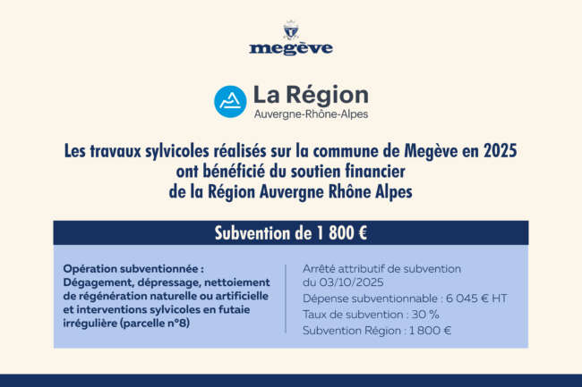 Les travaux sylvicoles réalisés sur la commune de Megève en 2025 ont bénéficié du soutien financier de la Région Auvergne Rhône Alpes Opération subventionnée : Dégagement, dépressage, nettoiement de régénération naturelle ou artificielle et interventions sylvicoles en futaie irrégulière (parcelle n°8) Arrêté attributif de subvention du 03/10/2025 Dépense subventionnable : 6 045 € HT Taux de subvention : 30 % Subvention Région : 1.800 €