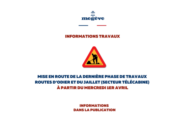 Secteurs Odier & Jaillet – Dernière phase de travauxÀ partir du mercredi 1er avril, la dernière phase de travaux va intervenir au niveau des routes d’Odier et du Jaillet (secteur télécabine) afin de finaliser les aménagements de surfaces. Au Jaillet, le chantier devrait s’étendre jusqu’à début juin avec une fermeture de route, hors accès riverains, et la mise en place du double-sens de circulation de la route de la télécabine, comme précédemment. Secteur Odier, les travaux devraient s’achever fin mai avec une fermeture de la voie, hors accès riverains, de manière identique à la phase automnale. À noter, une fermeture complète du carrefour Odier/chemin des Ânes durant 3 jours, les 15, 16 et 17 avril. Le carrefour réouvrira ensuite en demi-chaussée avec alternat de circulation durant la semaine du 20 avril avant un retour à la normale la semaine suivante. Les 18, 19, 20 et 21 mai, la route d’Odier ainsi que le carrefour avec le chemin des Ânes seront de nouveau fermés en journée pour la réalisation des enrobés. Les dates de chantier sont susceptibles d’évoluer en fonction des conditions météorologiques. Nous vous remercions par avance pour votre compréhension. Renseignements : DGAST (Direction Générale Adjointe des Services Techniques) -Tél. 04 50 21 26 05