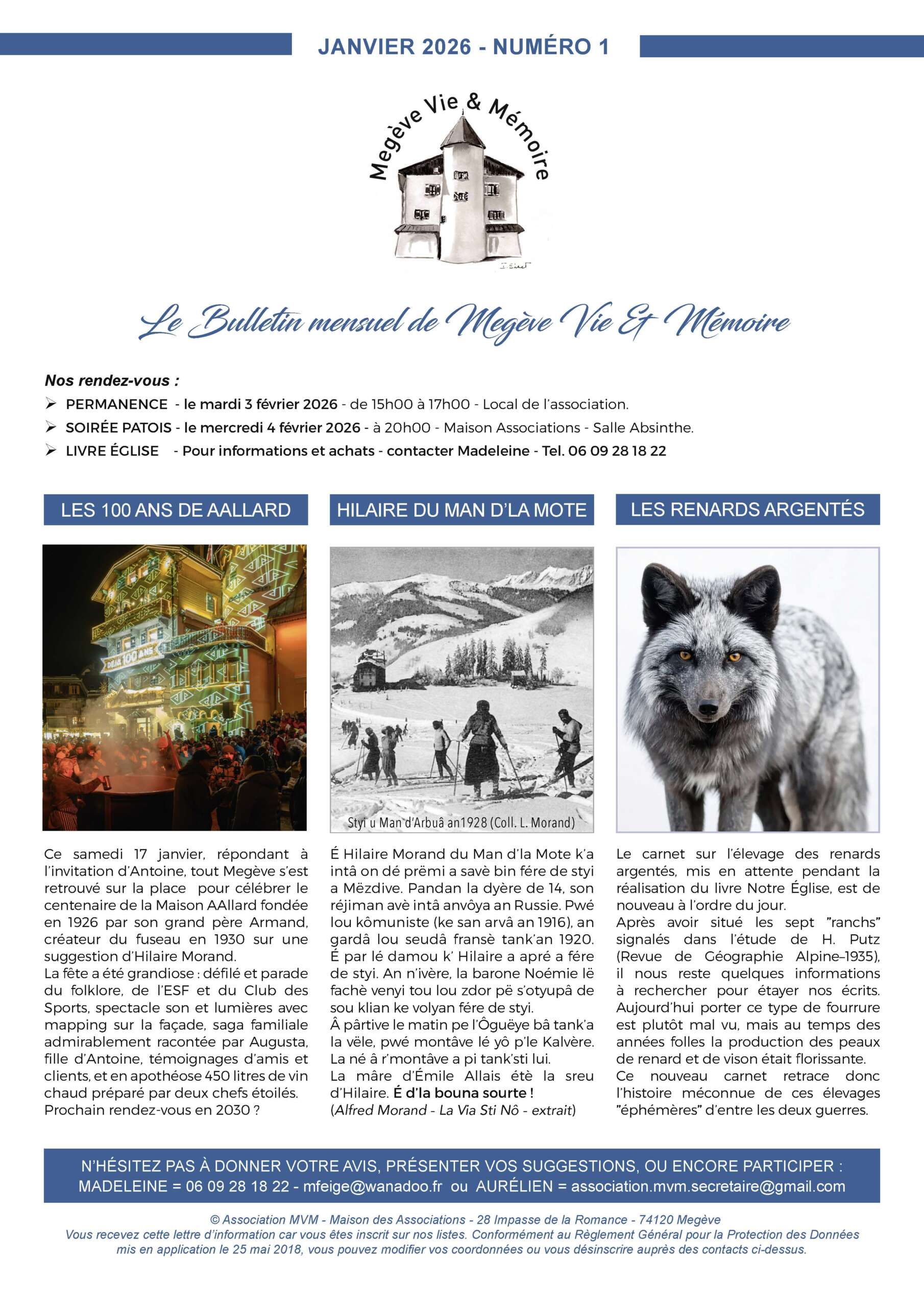 Megève Vie & Mémoire a été fondée en 2007 par un groupe de passionnés de Megève et Demi-Quartier, soucieux d’approfondir leurs connaissances et de contribuer à la mise en valeur de notre patrimoine historique et de notre identité culturelle.