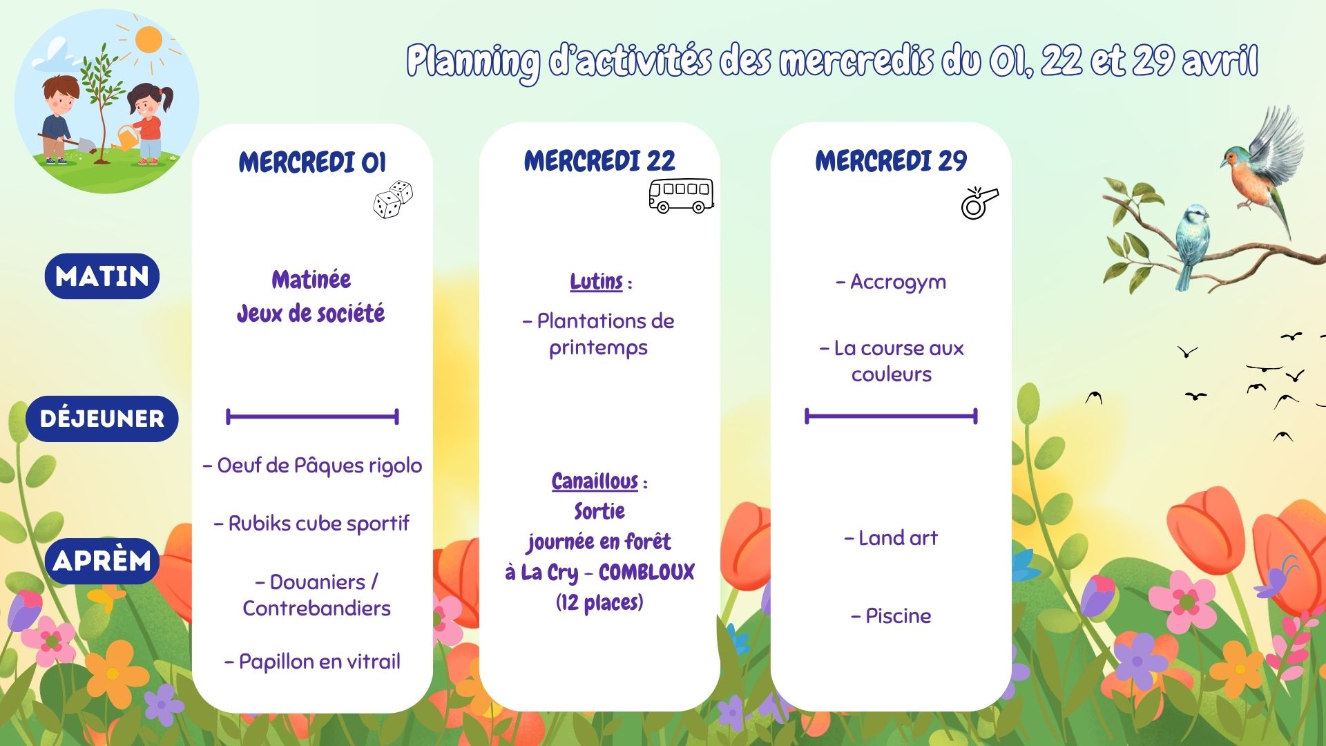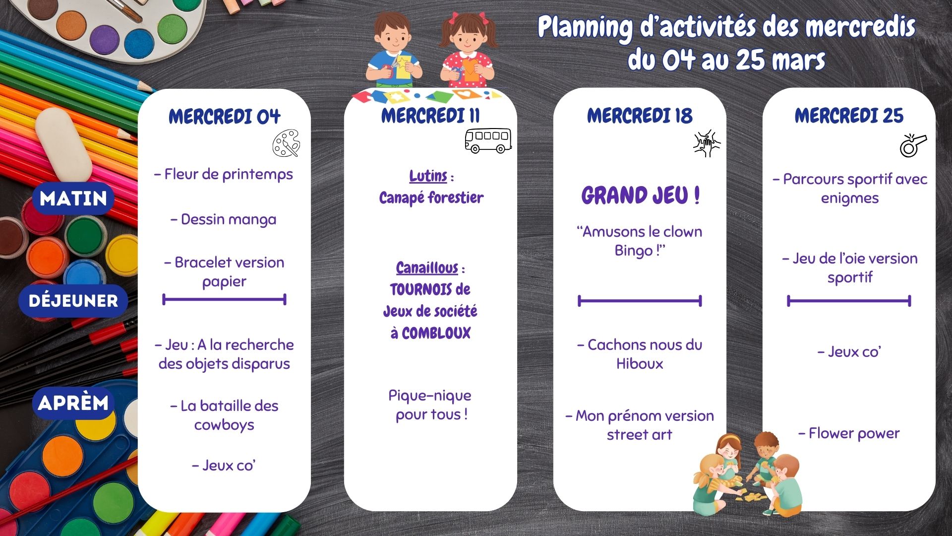 - Mercredis: inscription au plus tard le lundi précédent avant 9h; différentes formules sont proposées :