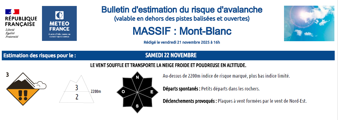 Veuillez trouver ci-après un lien pour le téléchargement du bulletin d’estimation du risque avalanche pour la journée du samedi 22 novembre 2025.